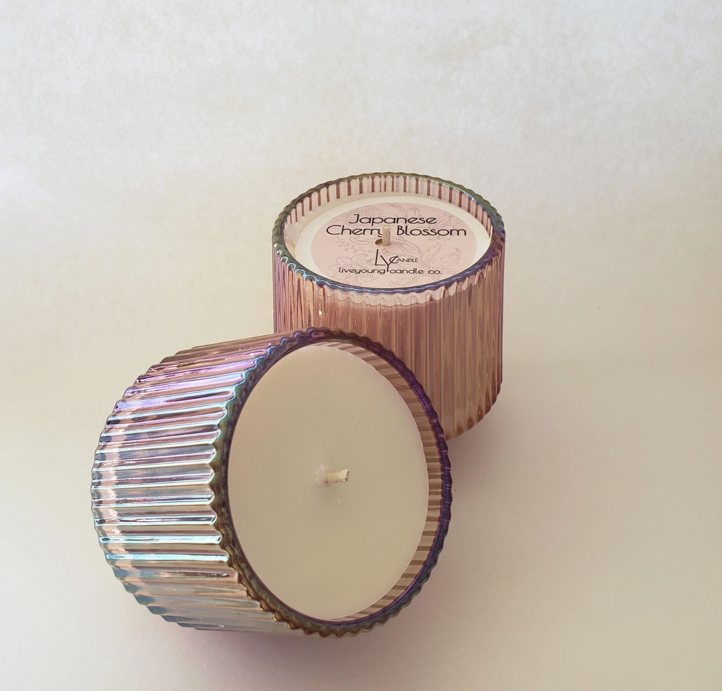 Iridescent retro style ribbed Pink jar candle.