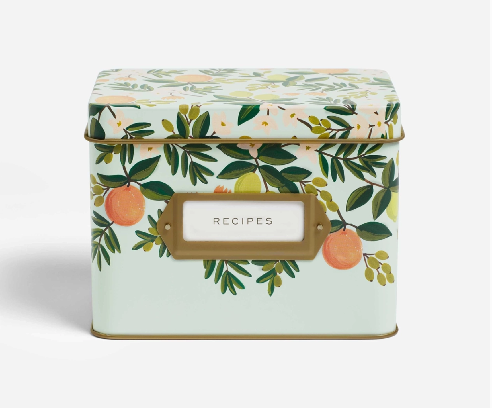 Bring a little cheer and charm to your kitchen with our floral Recipe Tins. Each box features a gold metallic interior, a gold-framed label on the front, and includes 24 recipe cards and 12 recipe dividers.